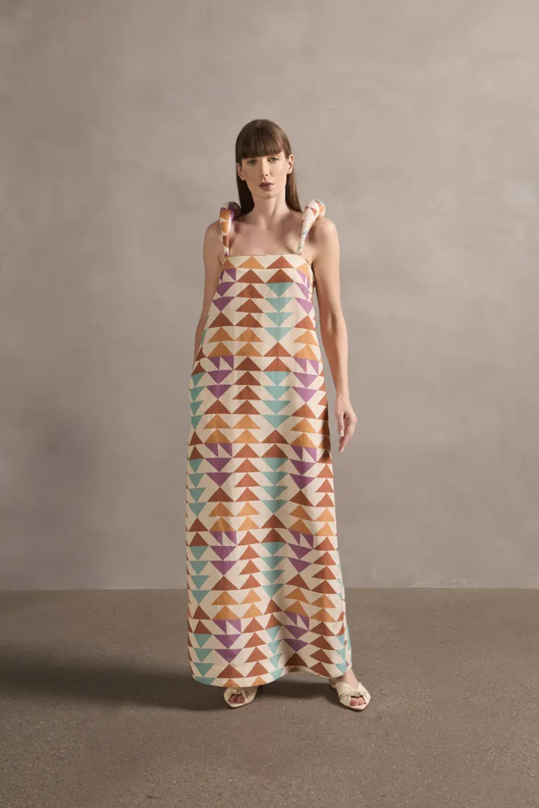 The Colibri Shoulder-Pad Long Dress is a wardrobe essential. Featuring structured straps and a vibrant triangle print, this shoulder-pad long dress lets you express your unique style for any occasion. Pair the dress with delicate earrings and a clutch bag for a chic, casual meal with friends.