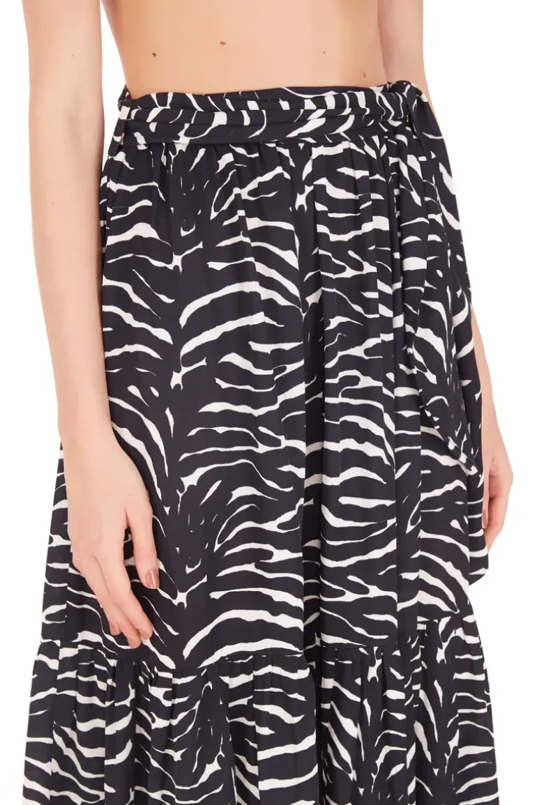 This wraparound viscose zebra skirt is shaped with a high-rise waist and is an elegant piece for summer weekends. The styling options are endless but we love it with the matching shirt and basket bag.