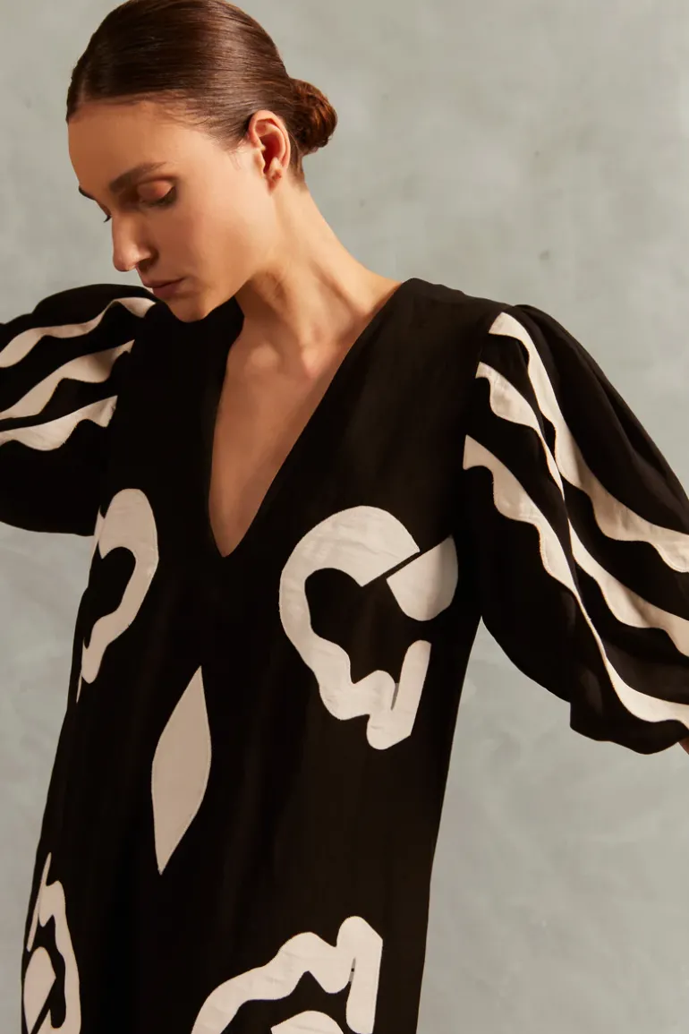 Long, Midi-Sleeves, V-Neckline, Appliqué