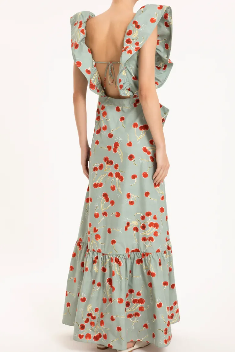 Ruffled; Long; Cherry Print; Square Neckline; Bow Detail