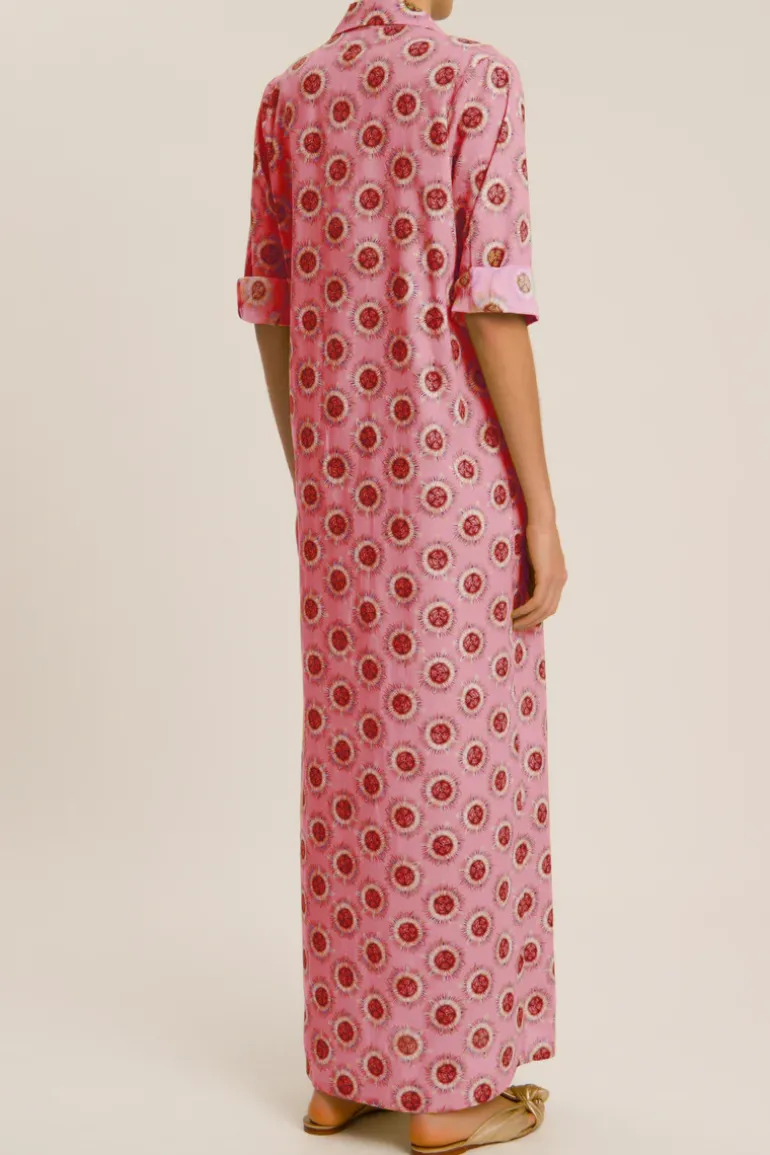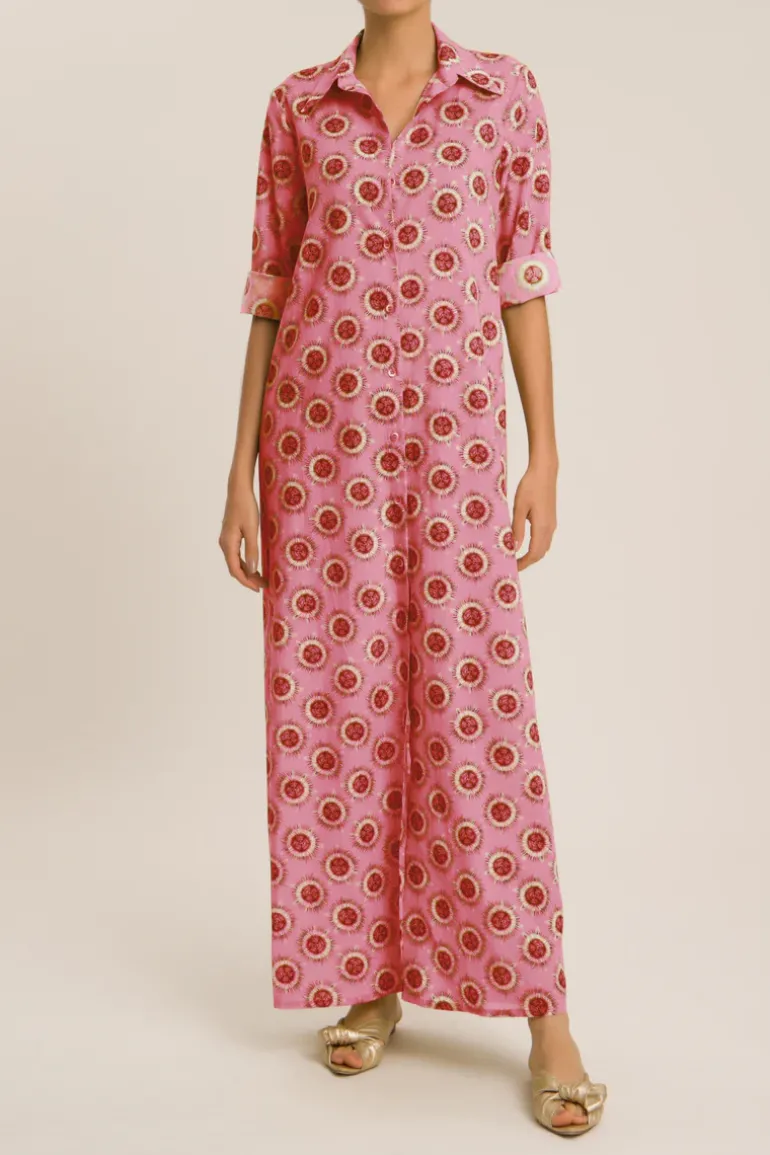 Our exclusive white and purple-tonal Floral print is featured on this full lenght, elegant chemise dress, with golden buttoning at front.