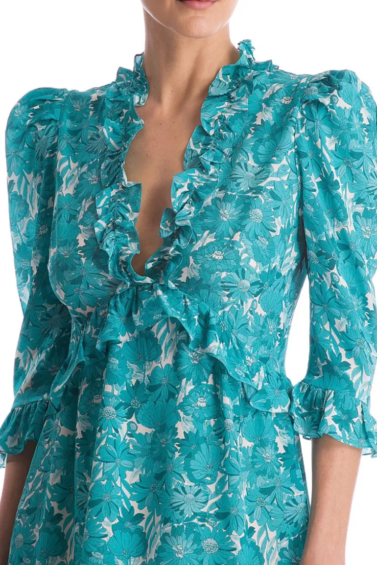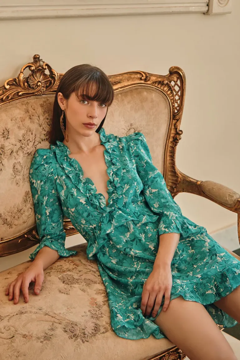 An effortless chic cocktail dress. Cut from lightweight silk, this dress has puffed sleeves and a ruffled framed neckline. Wear yours at a brunch with friends in the city.