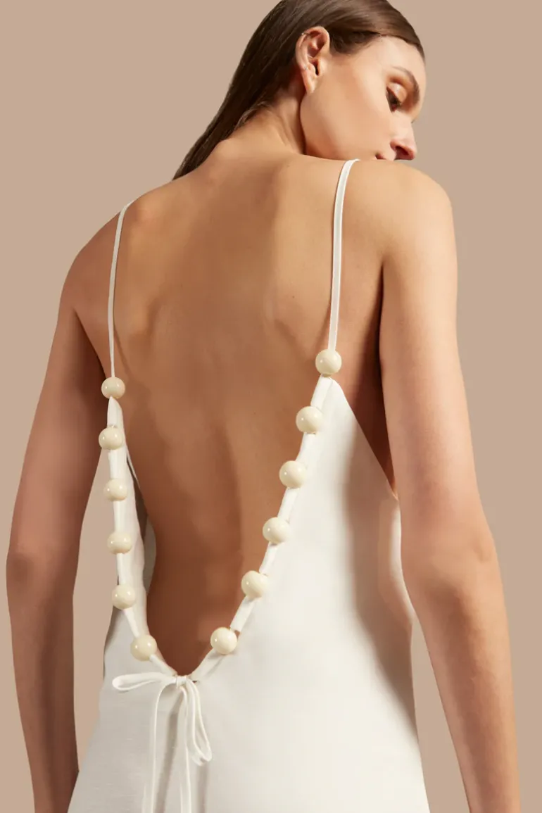 Thin Straps, Long, V-Neckline in the back, Ball-Shaped Applications