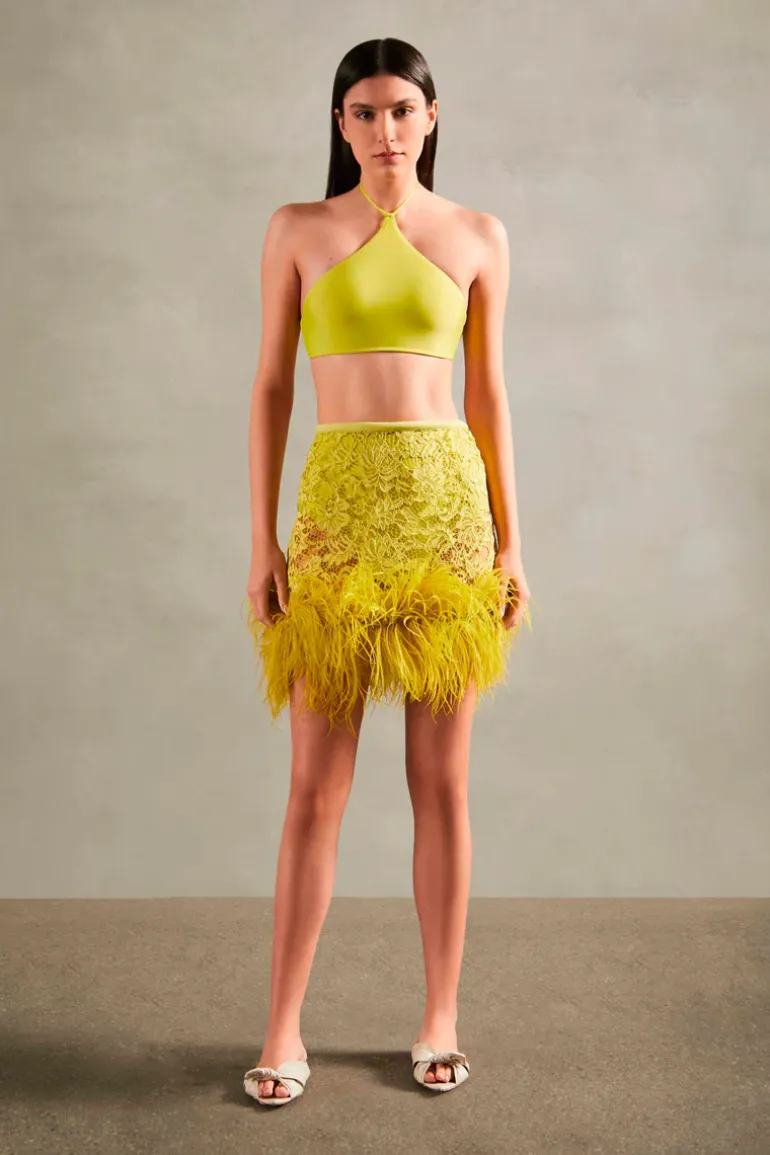 Look to Adriana Degreas for easy pieces like this Lace Feathered Mini Skirt to take to your next summer vacation. This Guipure Lace Feathered Mini Skirt is perfect for days or parties besides the beach.