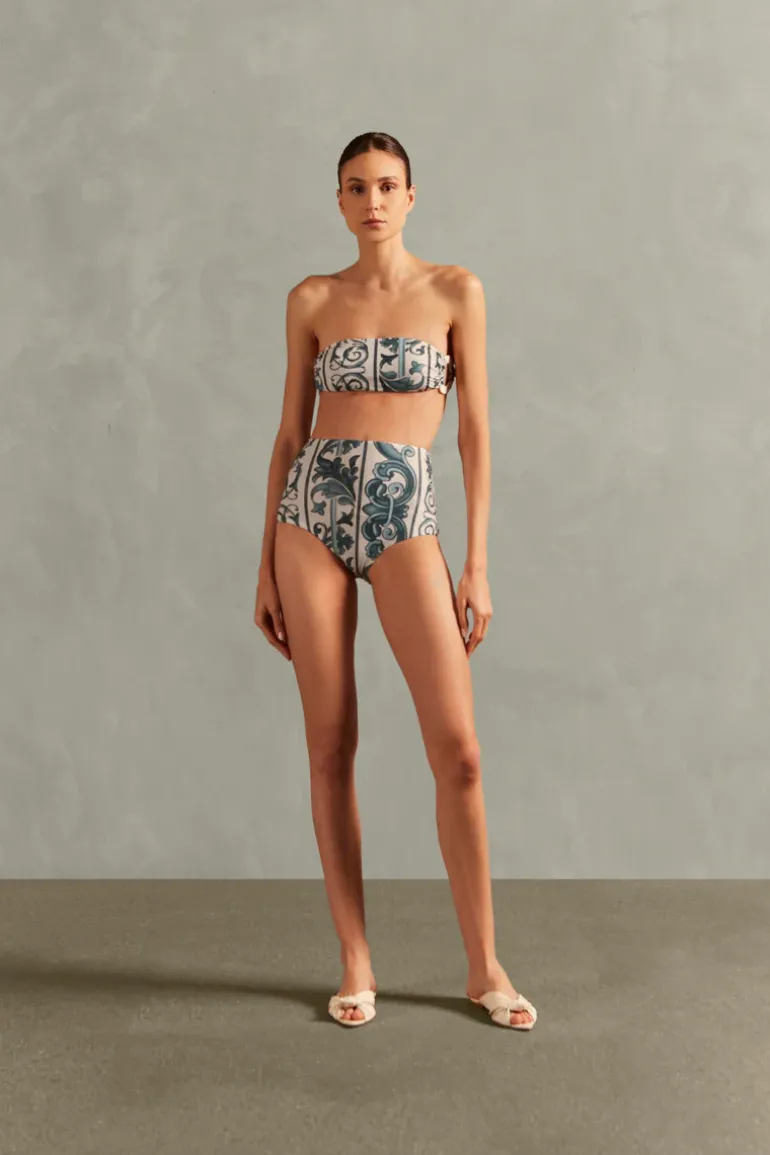 The Hera High-Waisted Bandeau Bikini has an elegant and vibrant vintage print. Pair the Hera High-Waisted Bandeau Bikini with flowing pants and sandals for a sunset meal with friends, creating an effortlessly chic look or use robes and pareo skirts as an overlay for different pool occasions.