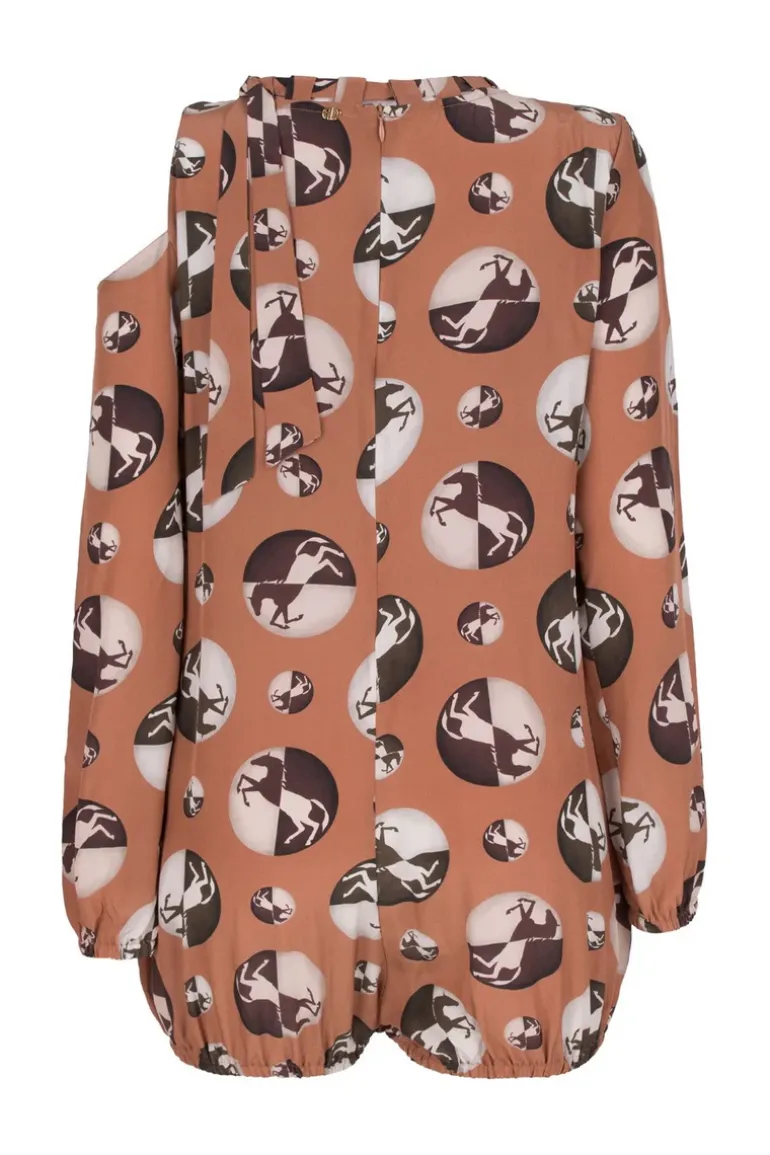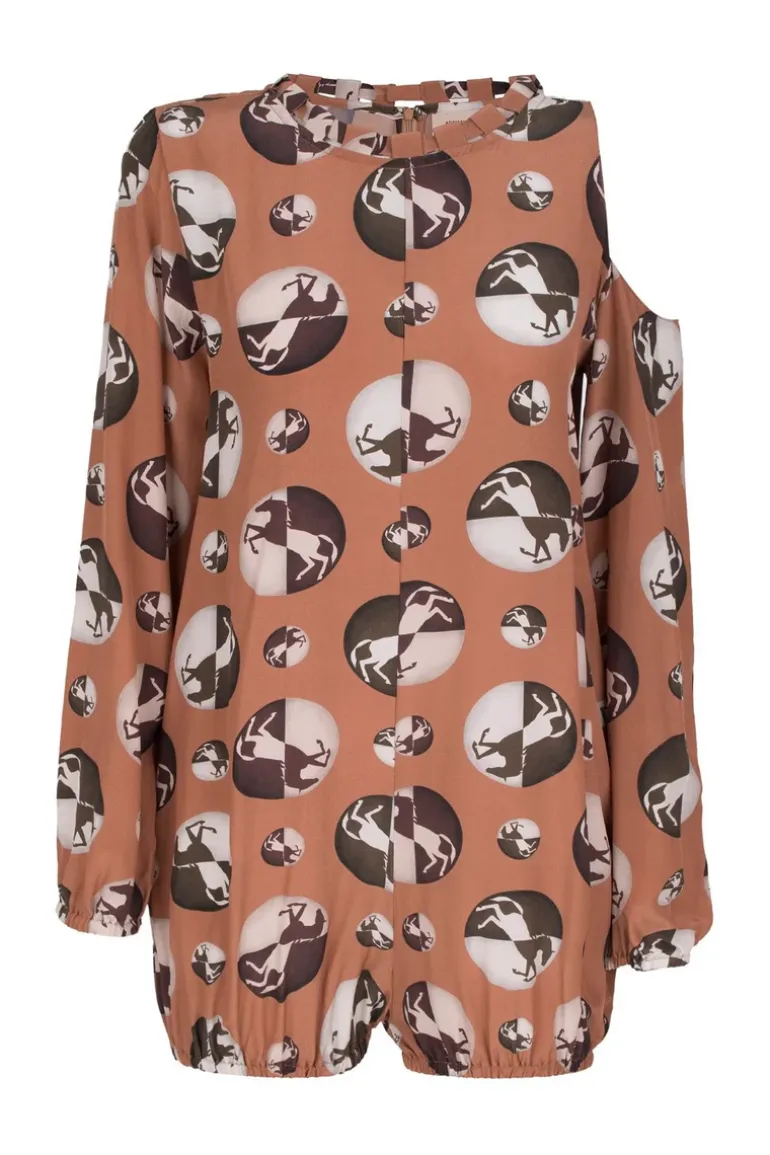 This silk horse pois playsuit is influenced by retro silhouettes. Wear it with silk a headscarf and a basket bag for sunset great walks on the beach.