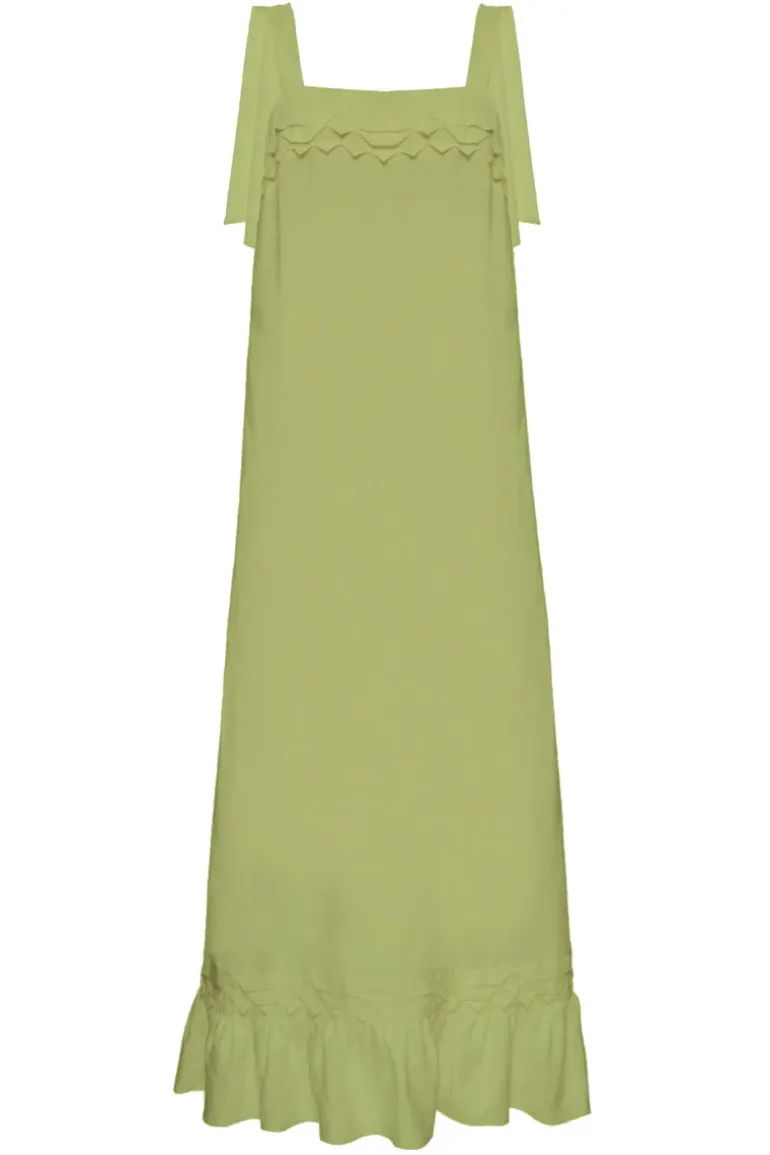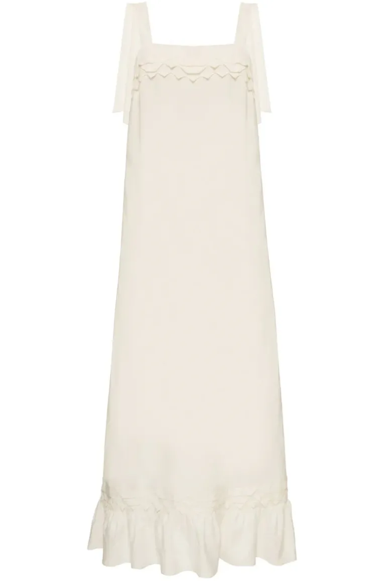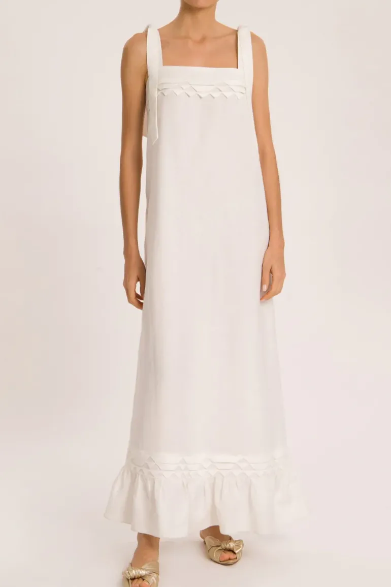 Think about effortlessly chic pieces to wear day and night like this long dress with handmade details. We love it with flat sandals and a beach bag.