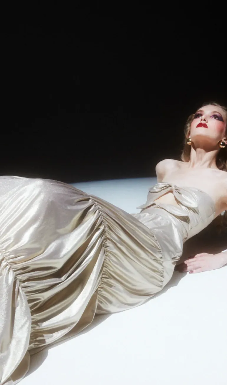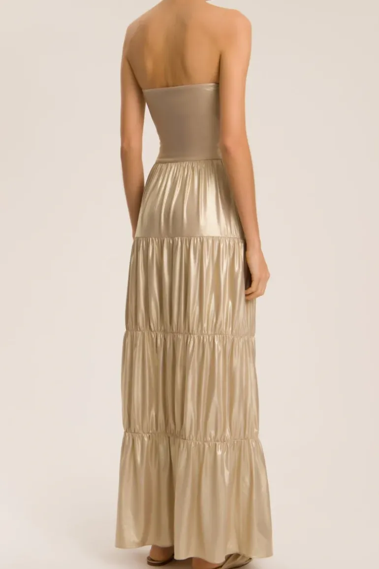 This long skirt is made of lightweight metallic fabric and can be worn in so many ways. We love it with a matching swimsuit and flat sandals poolside or sandals for a special evening.