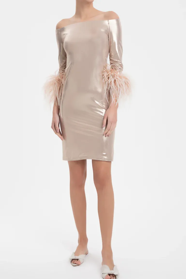 Crafted from polyamide and spandex, this Metallic Off-The-Shoulder Short Dress With Feathers will make a luxe addition to your party edit. Wear the Metallic Off-The-Shoulder Short Dress With Feathers with a flat sandals for a chic dinner.