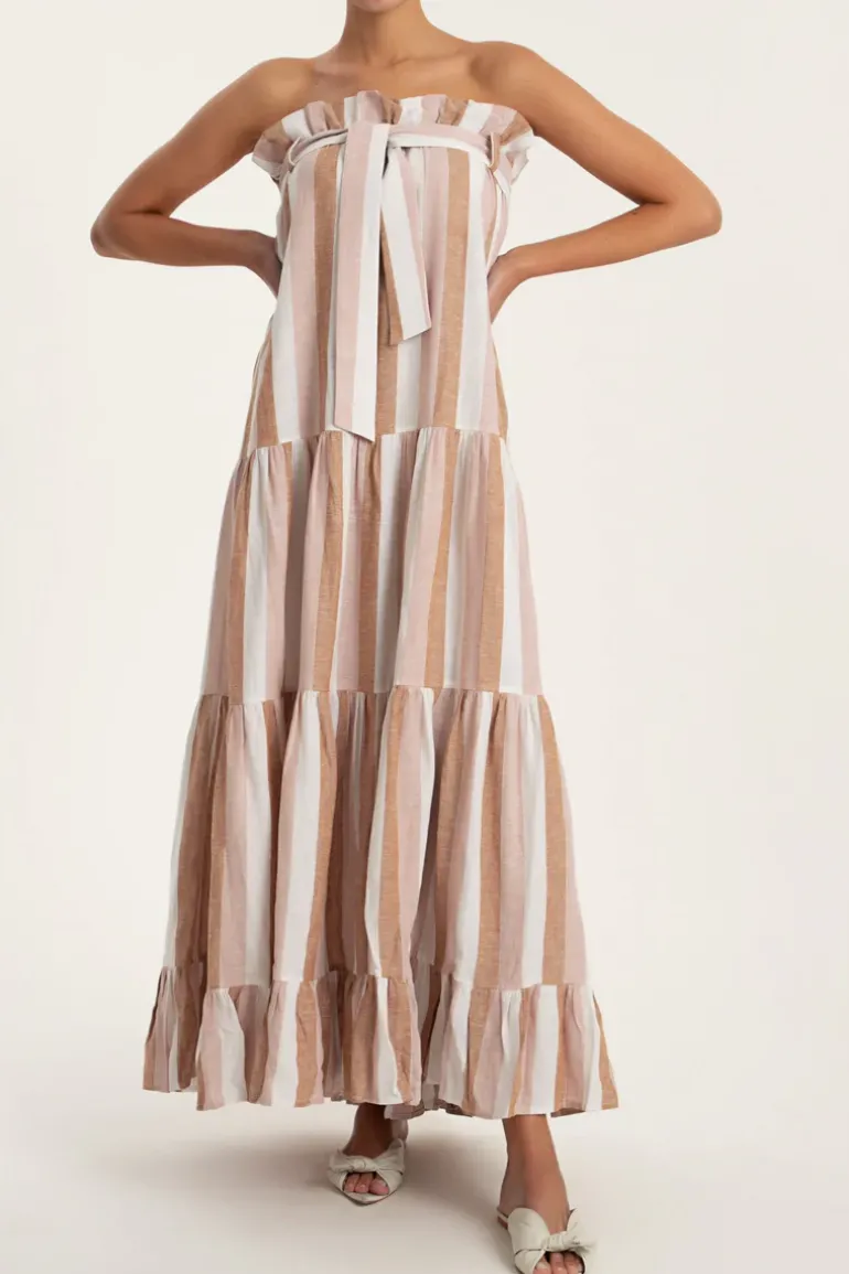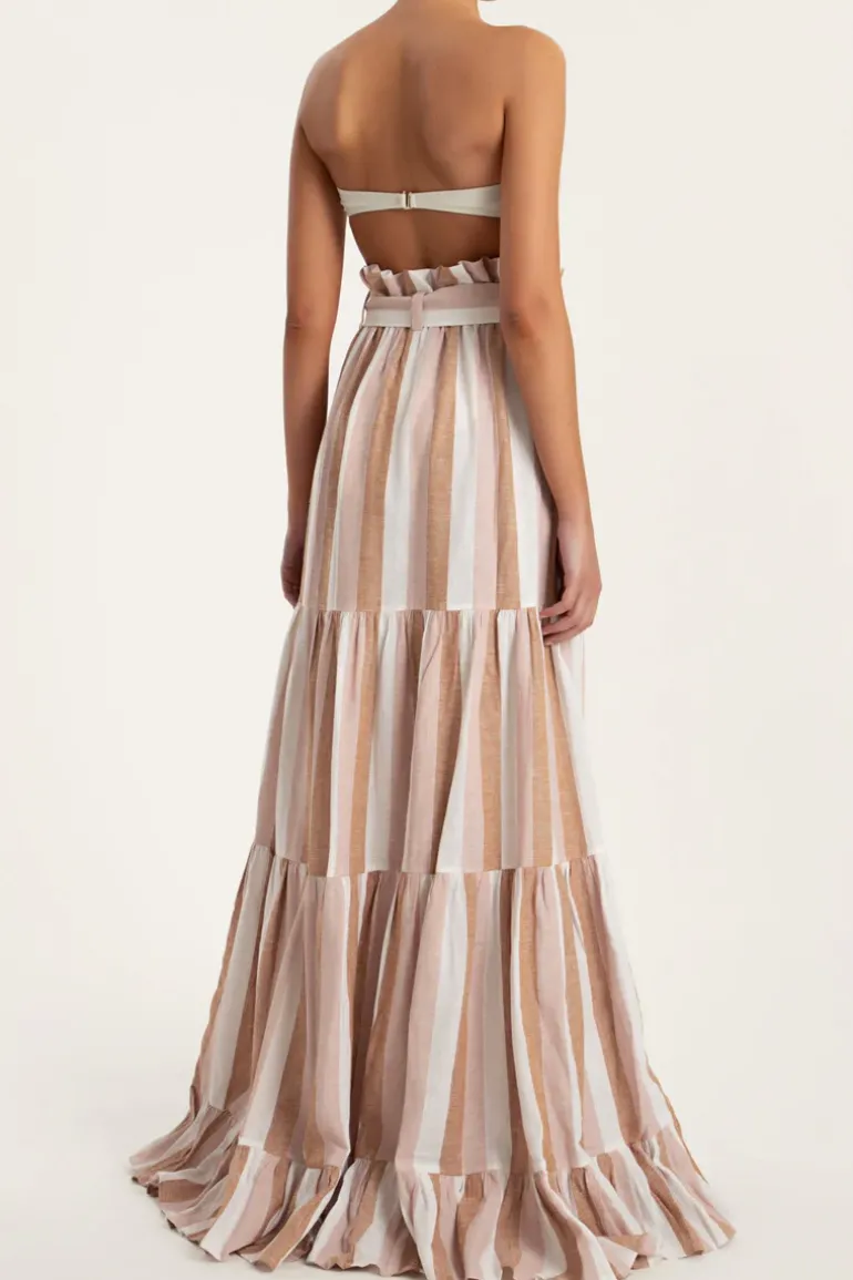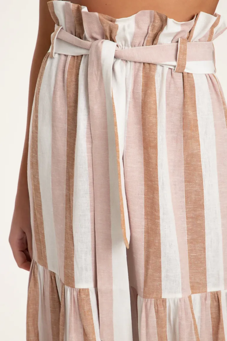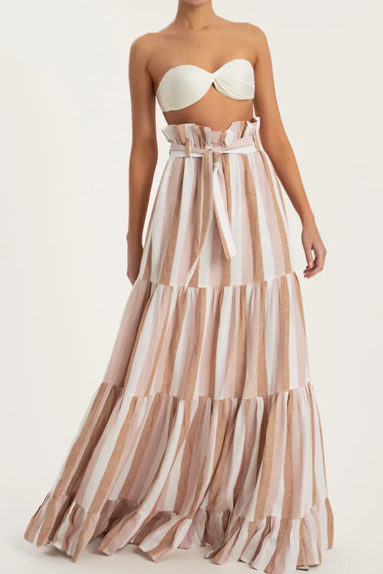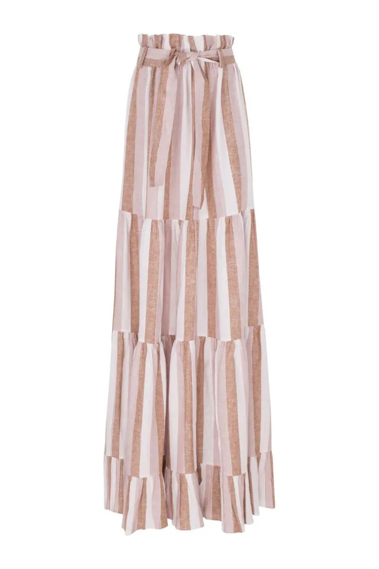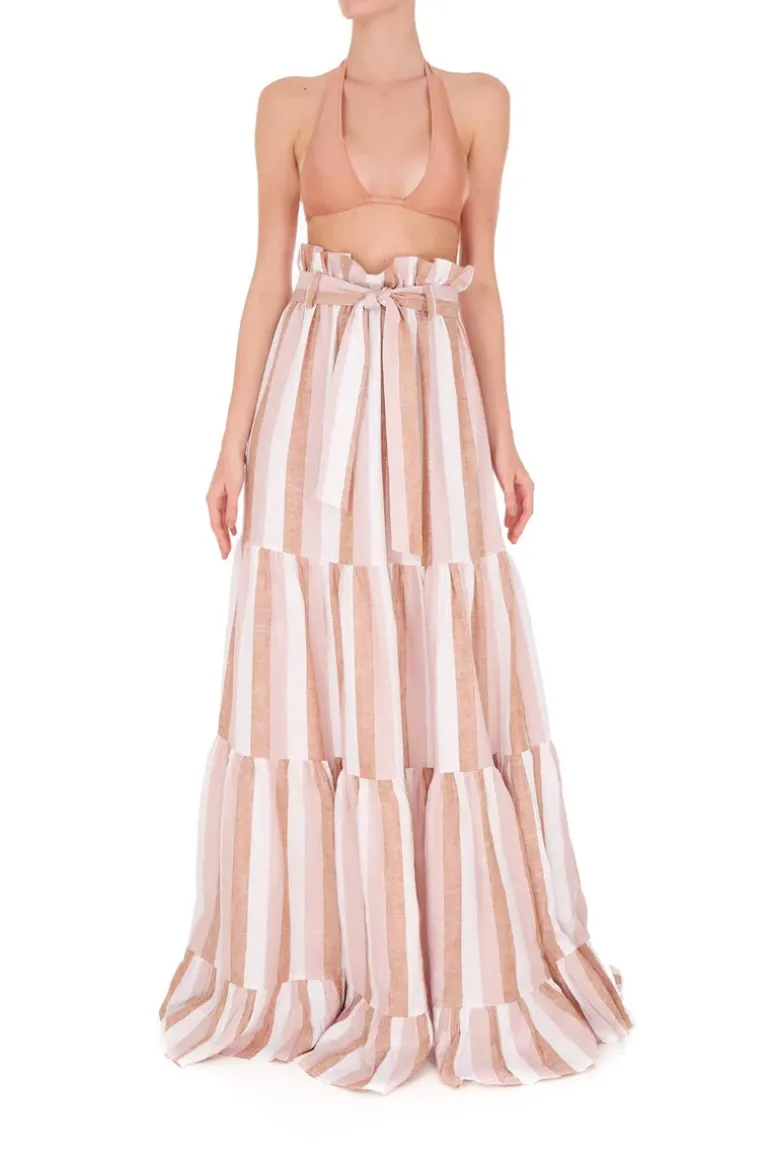 This Porto Striped Clochard Long Skirt is cut from linen and inspired by landscapes from the Italian city Portofino. It has a matching sash at the waist to cinch your figure. Wear the Porto Striped Clochard Long Skirt while on vacation with one of the label’s swimsuit.