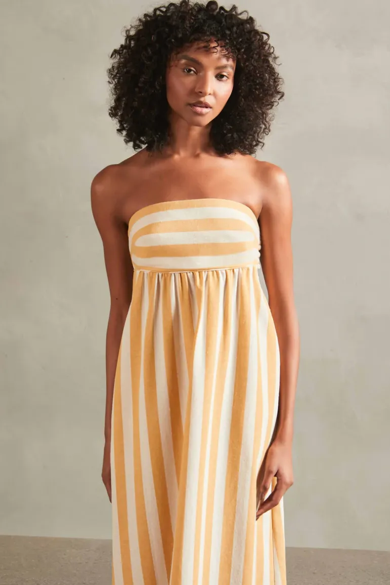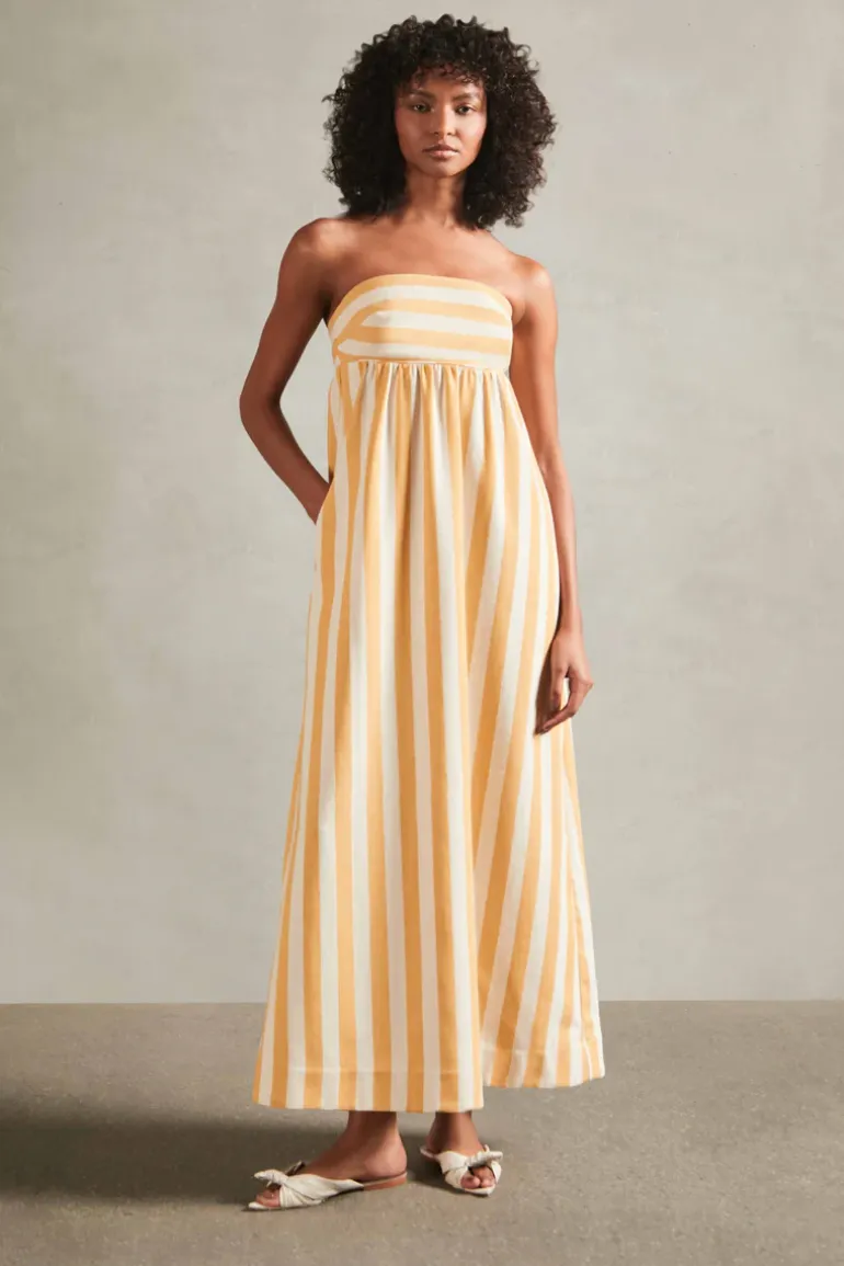 This Striped Strapless Long Dress is a favorite in the female wardrobe, it comes in the Riviera collection in a striped version – a key piece that should not be missing from your summer suitcase. Sophisticated and versatile, this striped strapless long dress features pockets, and can be worn for daytime events such as lunches or even evening occasions. Complete the look with low-heeled sandals and a coordinated clutch, and you’ll be ready for any of these situations.