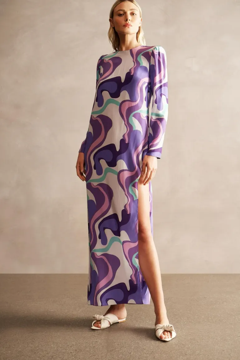 A favorite piece from the Adriana Degreas collections, the Long Dress appears in the Wave print, an illustration created from vintage references from the brand’s collection. The Wave Side Slit Long Dress can be worn during the day with flat sandals for an unpretentiously chic look, or even at night with metallic accessories if the occasion is festive.