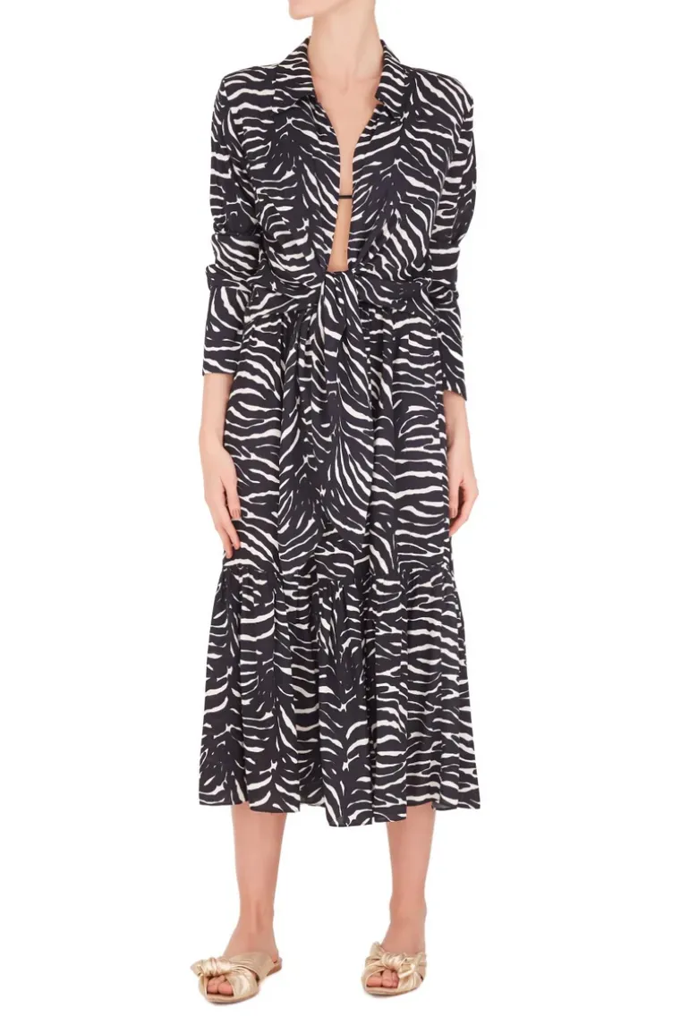 This wraparound viscose zebra skirt is shaped with a high-rise waist and is an elegant piece for summer weekends. The styling options are endless but we love it with the matching shirt and basket bag.